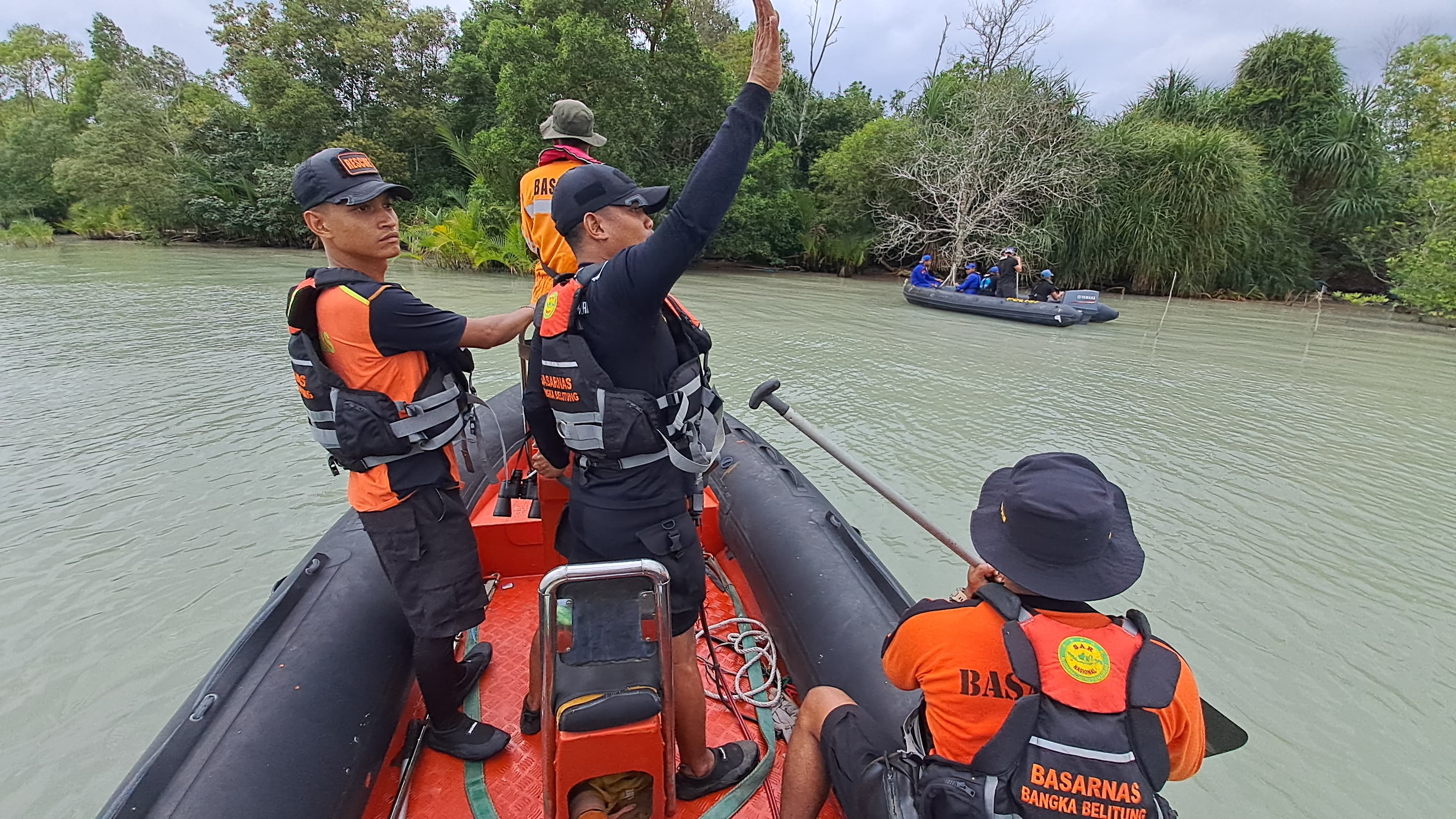 Menerima informasi tersebut Kantor SAR Pangkalpinang memberangkatkan 1 tim rescue menuju lokasi kejadian guna mencari keberadaan korban. Tim SAR gabungan yang terdiri dari tim rescue Kantor SAR Pangkalpinang, ABK KN SAR Karna, Ditpolairud Polda Babel, Satpolairud Polres Pangkalpinang, Laskar Sekaban, dan SakaSAR Pangkalpinang dengan menggunakan RBB dan perahu karet menuju lokasi kejadian. Tim juga mengiperasikan drone untuk mencari korban melalui udara.