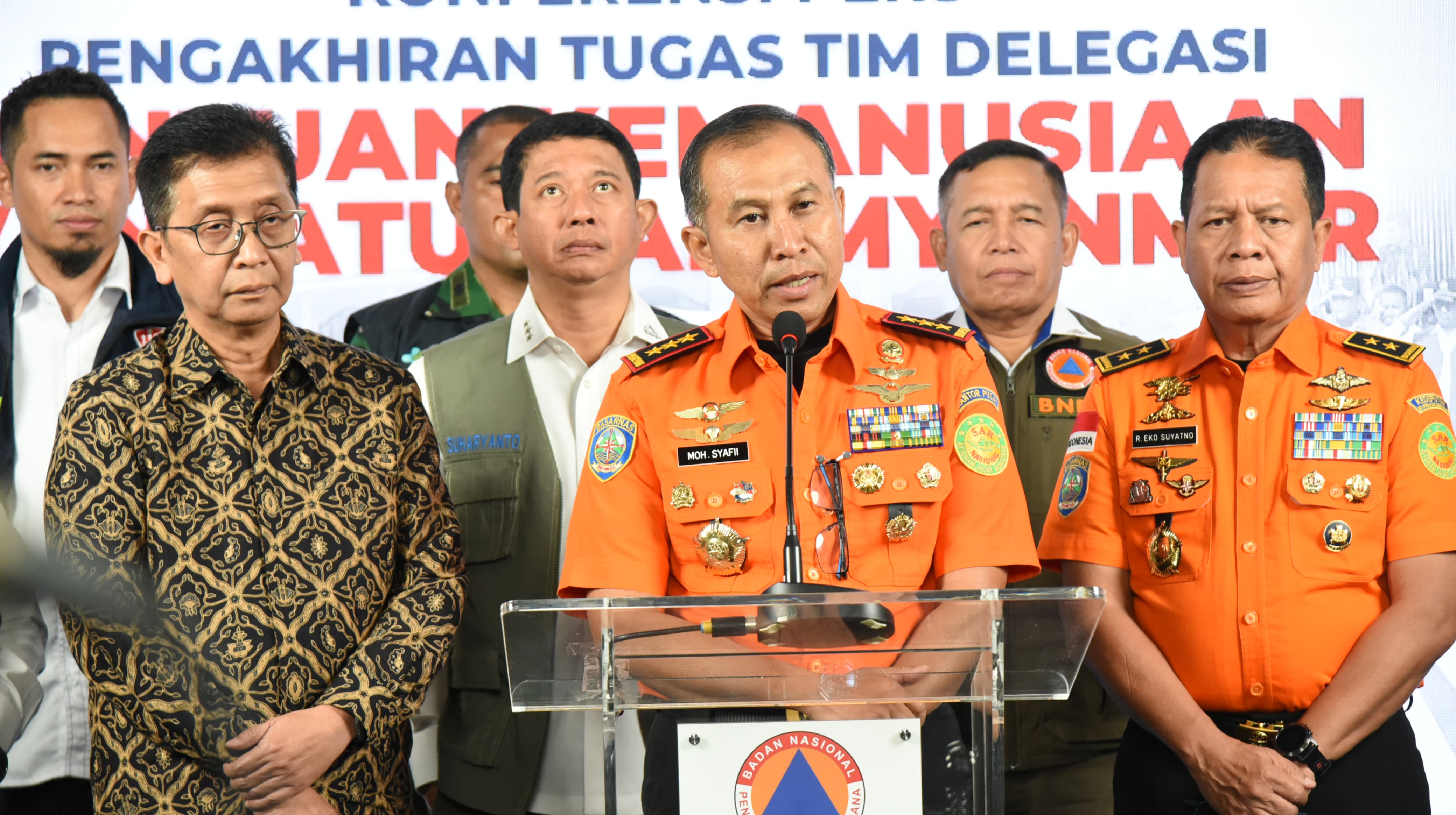 Jakarta - Kepala Basarnas Marsdya TNI Mohammad Syafii didampingi Deputi Bidang Operasi Pencarian dan Pertolongan dan Kesiapsiagaan Laksda TNI (Purn) R. Eko Suyatno beserta Tim INASAR hadir acara Pengakhiran Tugas Tim Delegasi Misi Kemanusiaan Darurat Bencana Vanuatu dan Myanmar, Selasa (20/5/3025). Acara tersebut dilaksanakan di Aula Kantor Pusat BNPB, Jakarta.