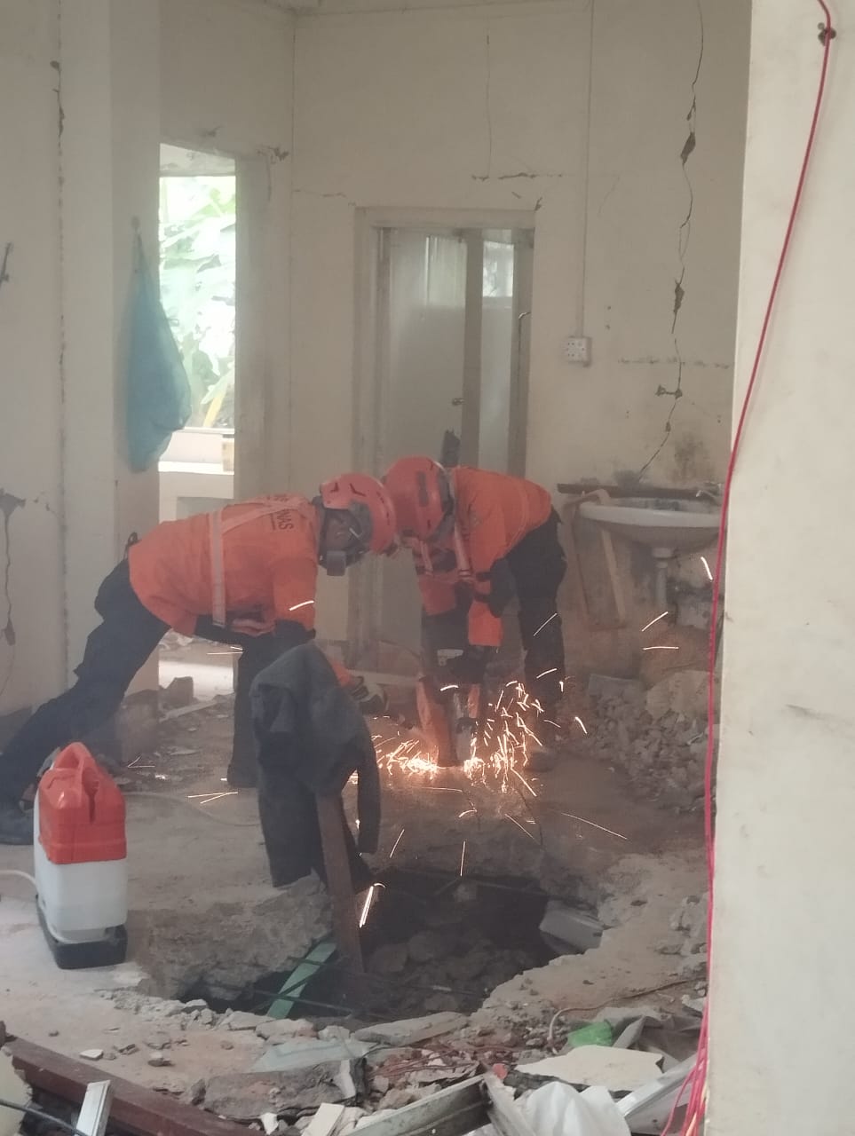 Komandan regu tim Alpha menambahkan dari 2 titik tersebut, tim putuskan membuat akses untuk memastikan keberadaan korban dengan memasukan alat search cam. "Tim Alpha berhasil memastikan posisi korban berada tidak jauh dari akses, sehingga tim memperbesar akses untuk menjangkau korban dengan cara cutting, breaking, dan breaching," sambungnya.