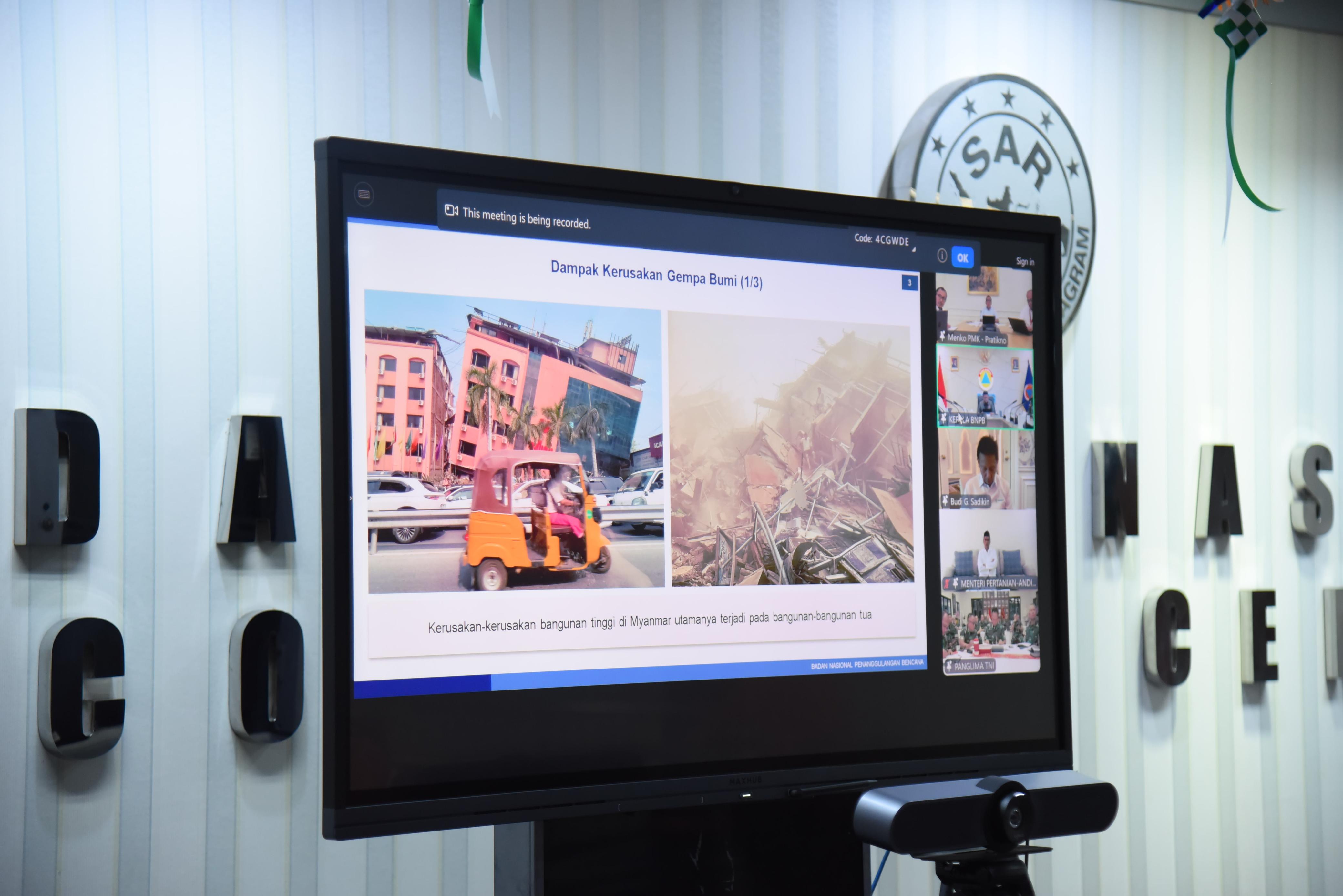 Basarnas berkoordinasi dengan beberapa Kementerian seperti Kemenko PMK, Kemenlu, Kemenkes, Panglima TNI, BNPB, Baznas, dan Lembaga lainnya terkait teknis dan prosedur perbantuan misi kemanusiaan Indonesia untuk gempa di Myanmar.