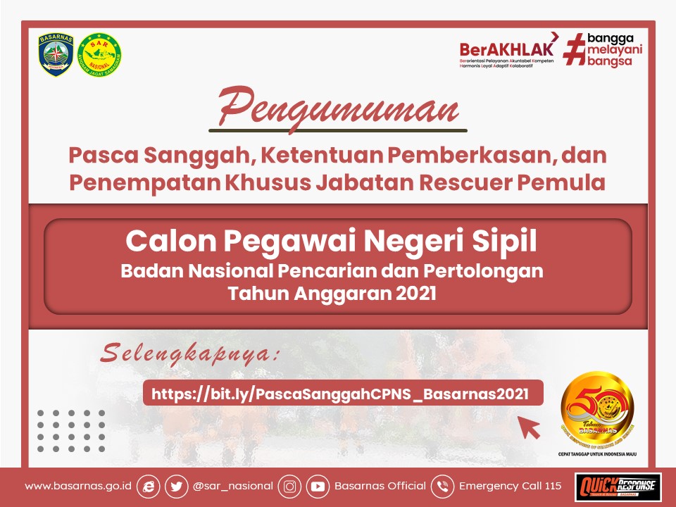Pengumuman Pasca Sanggah, Ketentuan Pemberkasan, dan Penempatan Khusus Jabatan Rescuer Pemula Calon Pegawai Negeri Sipil (CPNS) Badan Nasional Pencarian dan Pertolongan Tahun Anggaran 2021