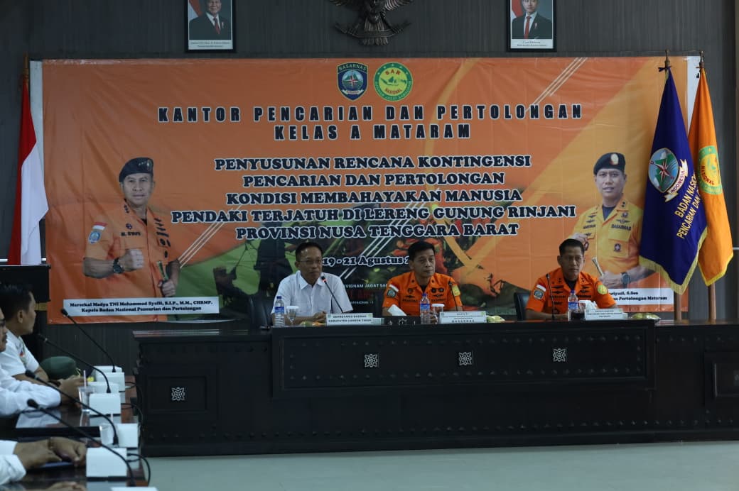 Lombok Timur — Deputi Bidang Operasi Pencarian dan Pertolongan serta Kesiapsiagaan Basarnas, Brigjen TNI (Mar) Edy Prakososecara resmi membuka Rapat Penyusunan Rencana Kontingensi Pencarian dan Pertolongan bertema “Kondisi Membahayakan Manusia Pendaki Terjatuh di Lereng Gunung Rinjani”, Rabu (20/8), di Kantor Bupati Lombok Timur.